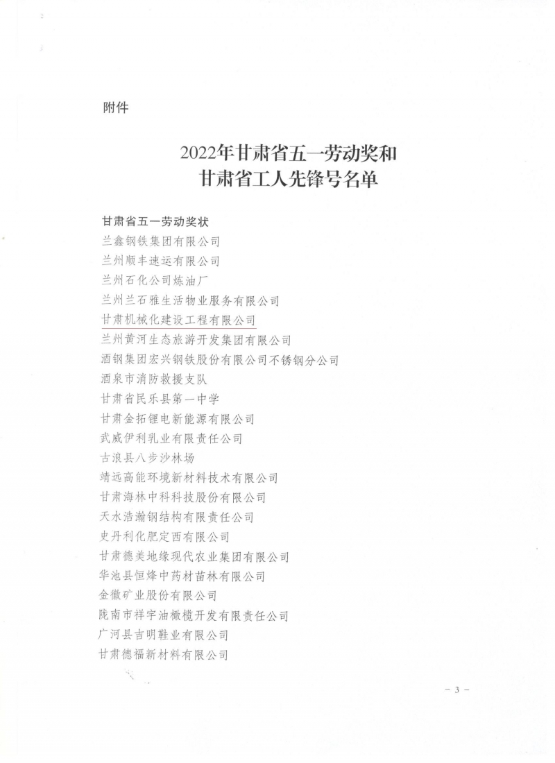 近日,甘肅省總工會(huì)發(fā)布了《關(guān)于表彰2022年甘肅省五一勞動(dòng)獎(jiǎng)和甘肅省工人先鋒號(hào)的決定》,我司被授予“甘肅省五一勞動(dòng)獎(jiǎng)”和“甘肅省工人先鋒號(hào)”。